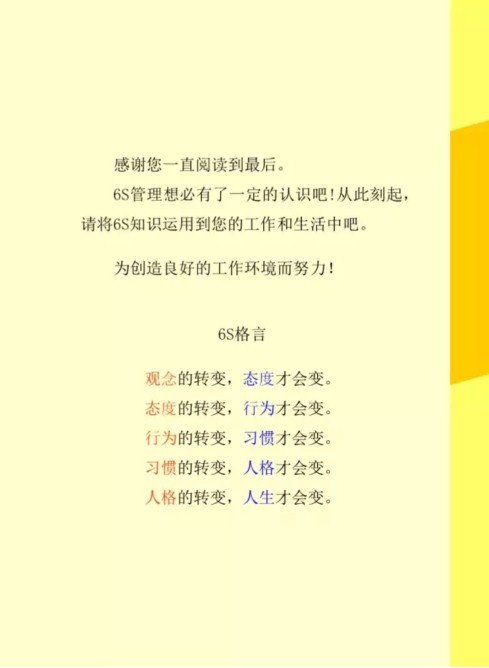 6S管理之素養(yǎng)的要領(lǐng):1.摒棄工作方面的傳統(tǒng)思維方式;2.不要試圖辯解,應(yīng)尋求解決的方法;3.首先,從否定性觀點(diǎn)分析工作現(xiàn)場(chǎng)......