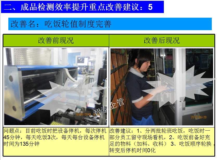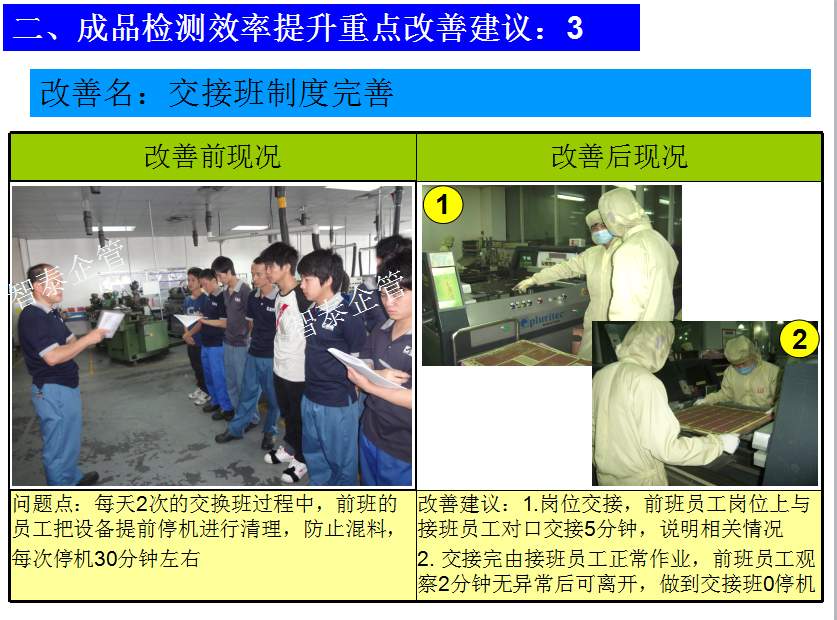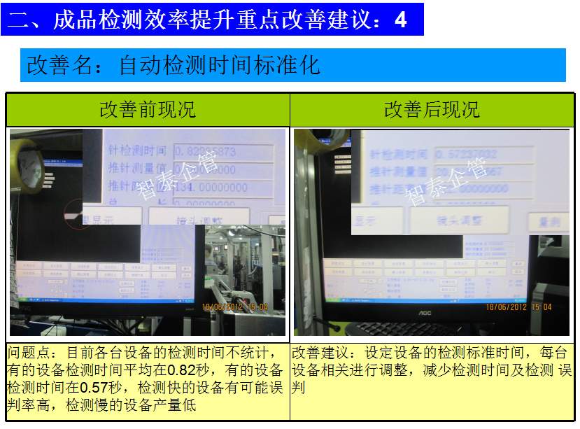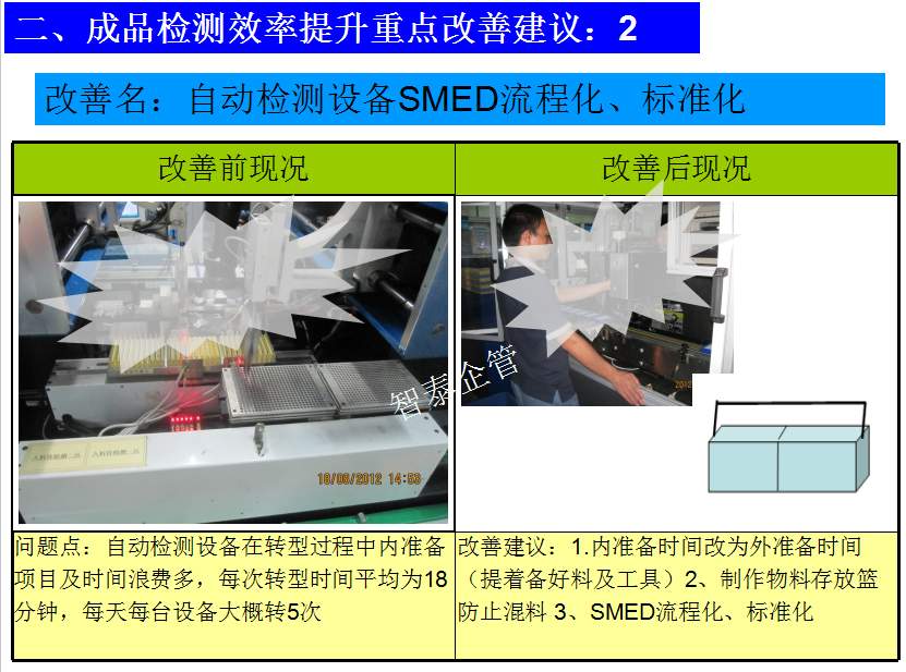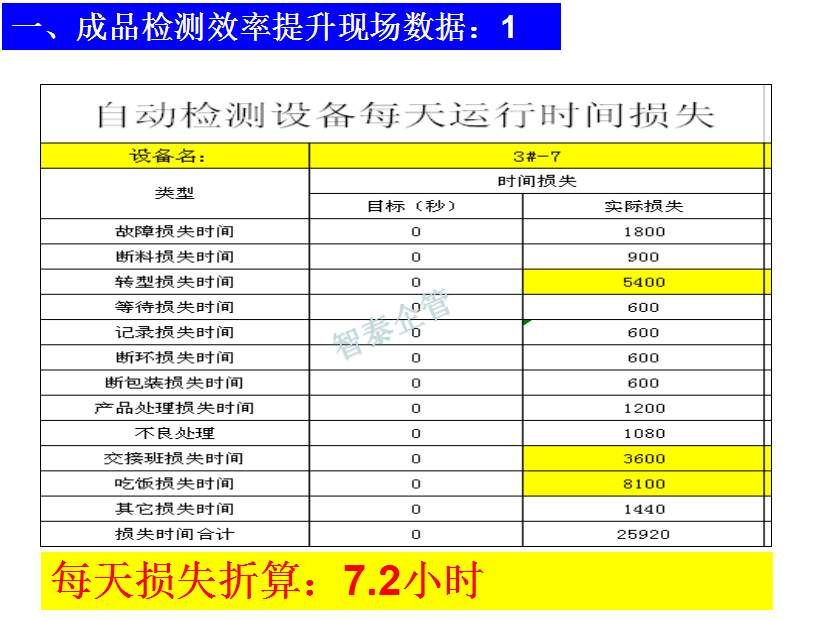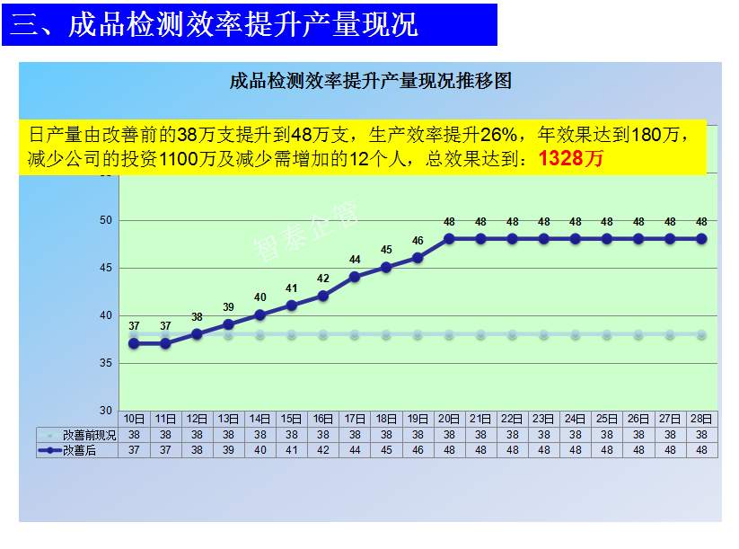 世界級制造及精益管理是智泰人一生追求的理想,智泰咨詢在企業(yè)推進(jìn)精益生產(chǎn)后平均生產(chǎn)效率提升35%以上,智泰專業(yè)團(tuán)隊為企業(yè)消除八大浪費,通過精益管理,提高企業(yè)的生產(chǎn)效率和產(chǎn)品質(zhì)量,持續(xù)推進(jìn)焦點課題改進(jìn)重大問題,每年給企業(yè)帶來的收益平均有800萬以上,附件為智泰咨詢顧問團(tuán)隊為某企業(yè)生產(chǎn)效率提升的案例,請查閱: