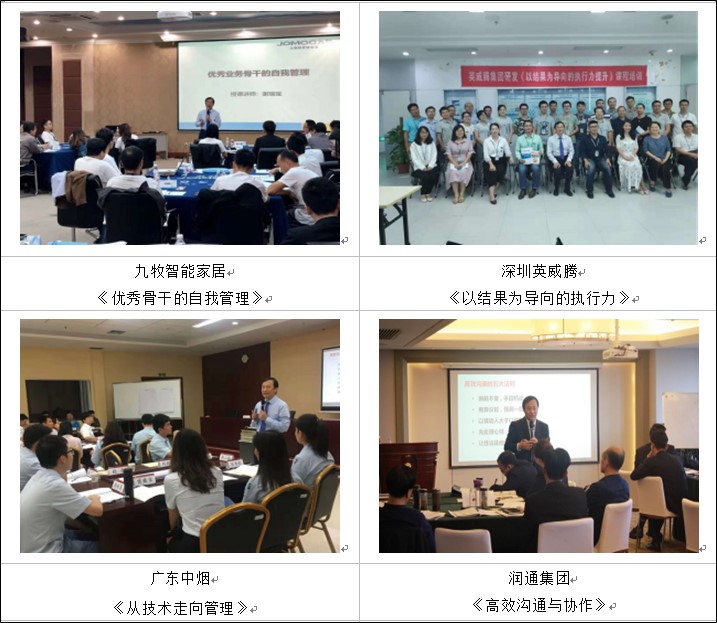 ★為家居建材十大壁紙品牌之一的浙江科翔壁紙講授《管理者核心技能提升》、《高效執(zhí)行力》、《自我管理》、《員工職業(yè)精神》、《高效溝通技巧》等一系列課程,2年時間為該公司各層級員工及經銷商先后培訓60多場,學員參訓人數達2000多人次,全面提升了該公司各級人員管理水平及綜合素質,深受公司及學員好評。后經該公司轉介紹,先后為方太廚具、廣州海鷗衛(wèi)浴、福建九牧智能家居等公司培訓相關系列課程。