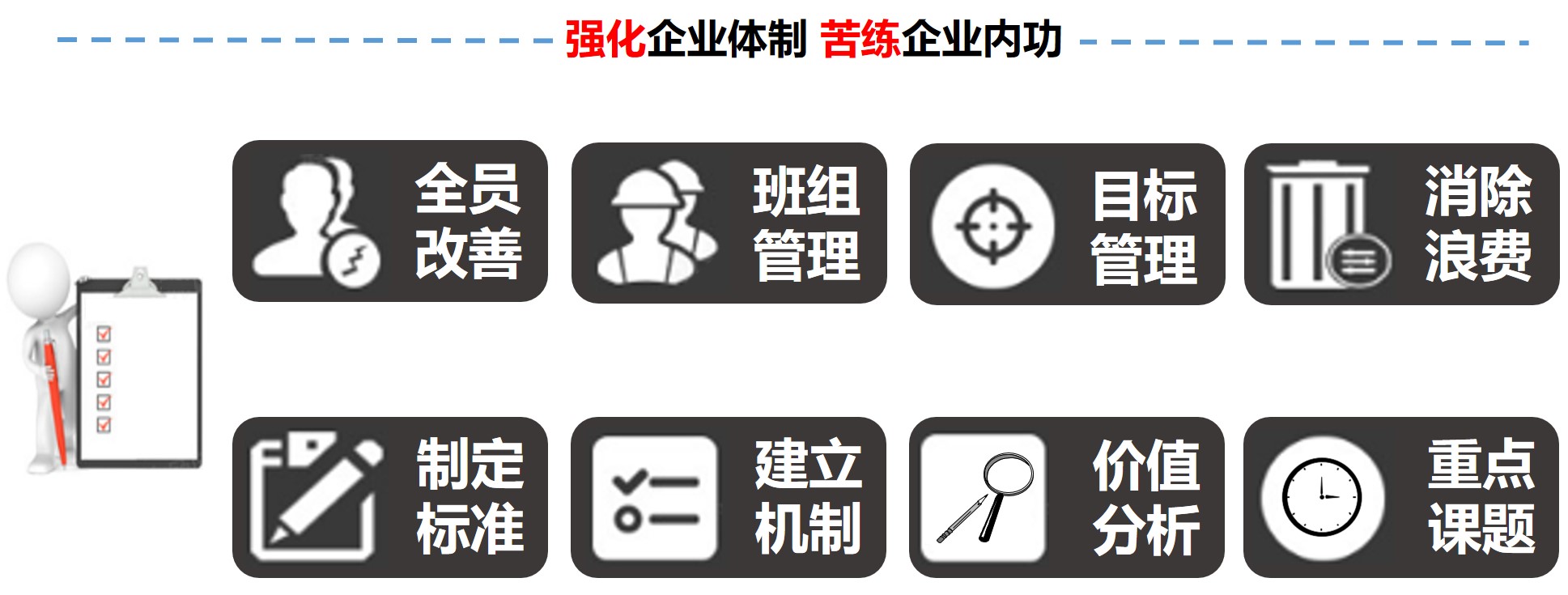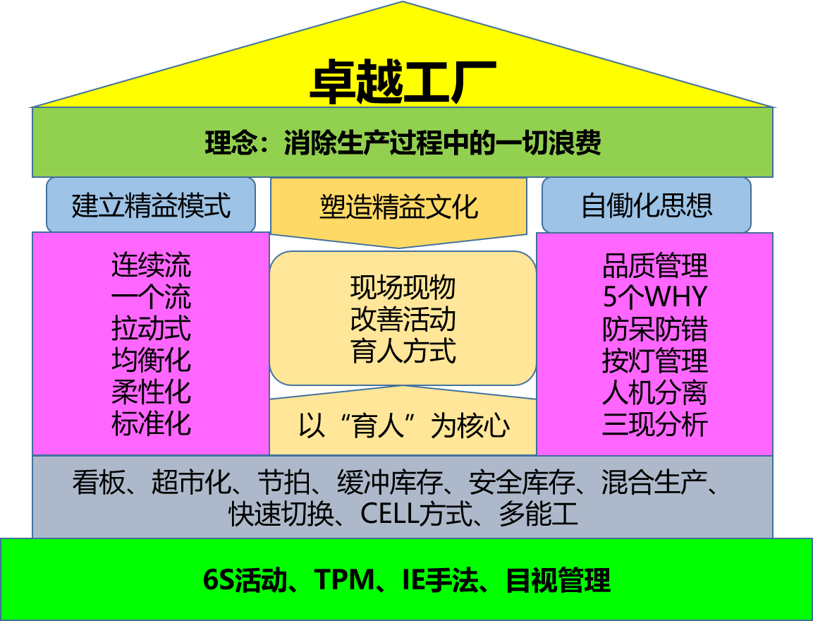 精益管理運(yùn)營系統(tǒng)是對企業(yè)運(yùn)營方式的重新整合,用來組織和管理企業(yè)產(chǎn)品開發(fā)、生產(chǎn)運(yùn)營以及供應(yīng)商和客戶的關(guān)系。精益運(yùn)營系統(tǒng)關(guān)注整個價值鏈,從接受訂單接受至訂單完成作為一個整體,通過快速的問題解決持續(xù)改進(jìn),通過消除不增值活動來增加增值工作的比例。采取準(zhǔn)時制(Just In Time)原則來管理資產(chǎn)和現(xiàn)金;應(yīng)用帶人智的自働化(Jidoka)來保證品質(zhì)、交期、管理速度及戰(zhàn)略聚焦。