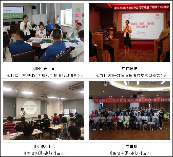為通訊行業(yè)培養(yǎng)1000余名優(yōu)質(zhì)員工及管理者:多次應(yīng)邀為四川移動(dòng)、成都移動(dòng)、四川電信、成都電信、四川通信服務(wù)公司、涼山通信服務(wù)公司等進(jìn)行《習(xí)贏職場-高效能人士的七把金鑰匙》、《由兵到將-新晉管理者成功轉(zhuǎn)型修煉》、《新員工職業(yè)化和服務(wù)營銷》等課程培訓(xùn),為通訊行業(yè)培養(yǎng)1000余名優(yōu)質(zhì)員工及管理者,客戶滿意度達(dá)94%以上。
