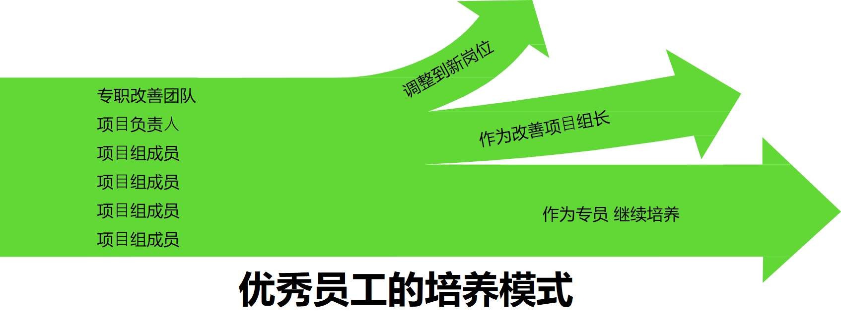 各分車間選撥專職人員,首先作為改善提案和核心人員或?qū)T進(jìn)行培養(yǎng),接受咨詢顧問(wèn)和推進(jìn)辦的指導(dǎo),承擔(dān)部門內(nèi)項(xiàng)目負(fù)責(zé)人或項(xiàng)目成員的角色,根據(jù)在項(xiàng)目中的表現(xiàn),調(diào)整到合適的新崗位或晉升(繼續(xù)專職或兼職改善工作)